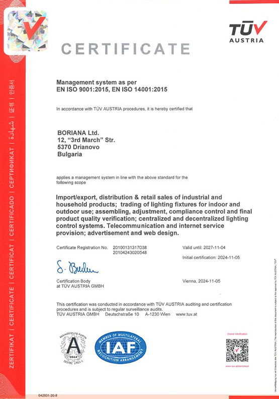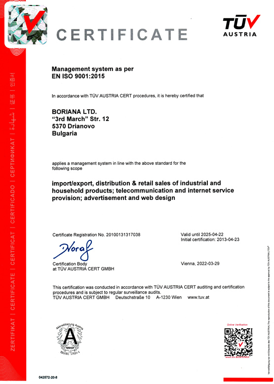 Boriana Ltd. implements a management system in accordance with BDS ISO 9001:2015